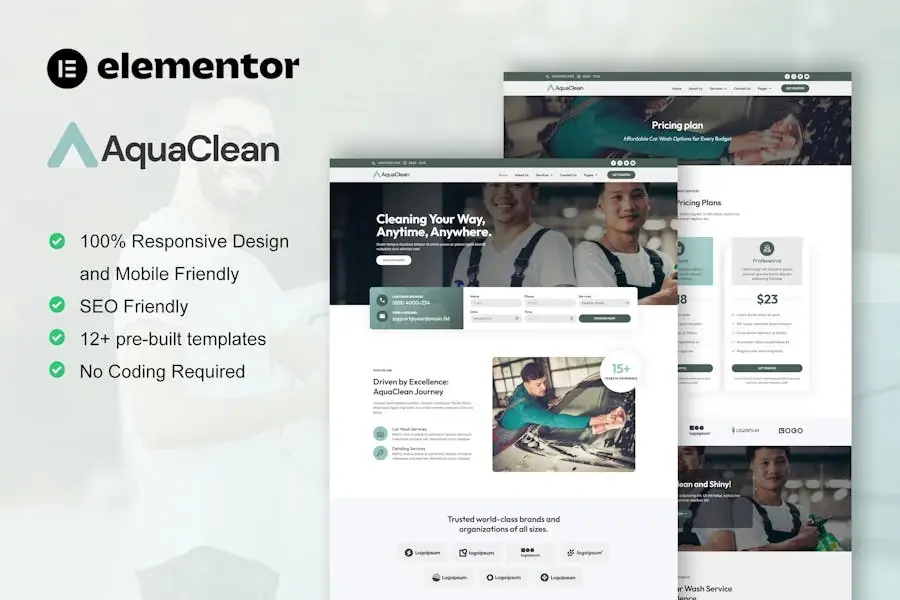 AquaClean – Kit de plantillas Elementor para servicios de lavado y limpieza de automóviles
