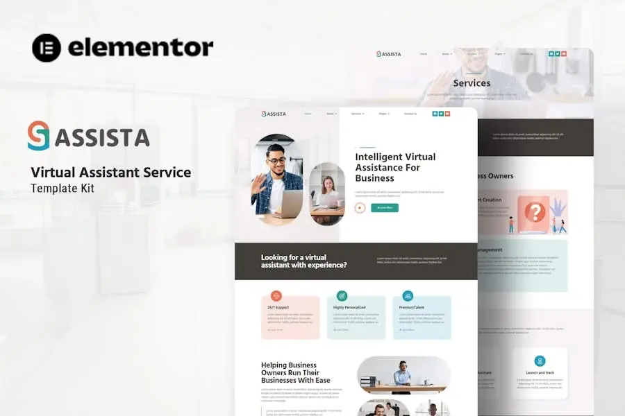 Assista es un template kit de Elementor para agencias de servicios de asistentes virtuales. Diseño profesional y limpio. Assista usa elementos gratuitos, así que no te preocupes por probar este. Assista ofrece varias páginas, que incluyen Inicio, Acerca de nosotros, Equipo, Servicios, Servicios individuales, Precios, Preguntas frecuentes, Blog, Blog único, 404, Contáctenos