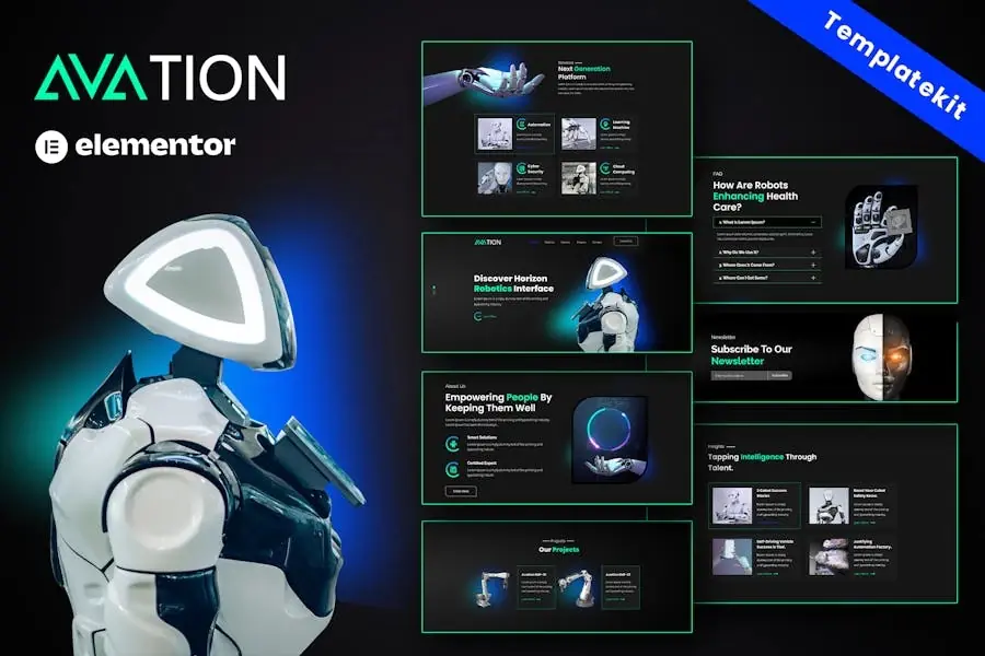 template kit Avation Elementor es la solución definitiva para crear un sitio web de vanguardia para su empresa o laboratorio de investigación de robótica e IA. Esta Colleción de Plantillas y páginas prediseñadas, creada para el generador de páginas Elementor, permite una fácil personalización y está diseñada con una estética moderna y tecnológicamente avanzada. La página de servicios está diseñada para mostrar los diferentes servicios que ofrece la empresa o el laboratorio en un formato fácil de leer y navegar, destacando las capacidades únicas de su organización. Personalice las Plantillas para que coincidan con su marca y estilo con una variedad de opciones de personalización de colores, fuentes y diseños. Su sitio web será totalmente responsivo, lo que proporcionará una experiencia de usuario perfecta en cualquier dispositivo. Con el template kit Elementor de Aviation – Robótica e Inteligencia Artificial, tendrás todo lo que necesitas para mostrar el trabajo vanguardista de tu empresa. La página de servicios está diseñada para mostrar los diferentes servicios que ofrece la empresa o el laboratorio en un formato fácil de leer y navegar, destacando las capacidades únicas de su organización.