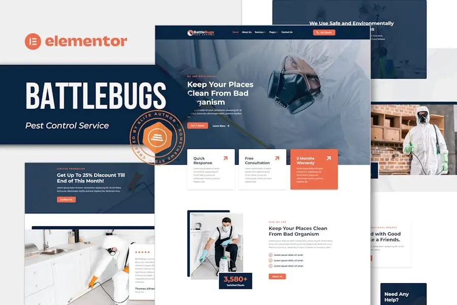 BattleBugs – Pest Control Service Elementor Template Kit. BattleBugs is has 12+ pre-built templates with fully responsive, clean design and customizable theme. Murphy can be used for pest control, mosquito control, rodent control, bed bug control, and any services related to pest control. BattleBugs as well as layouts for Protfolio to show their cool, beautiful and amazing project.