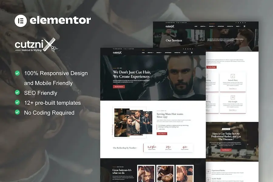 Cutznix es el Kit de plantillas Elementor para el sitio web de barbería y sus servicios relacionados, como estilos de corte de pelo, recorte de barba, afeitado suave, máscara facial, coloración del cabello, cabello liso, etc. Tiene más de 12 plantillas prediseñadas con un diseño limpio y un estilo moderno.