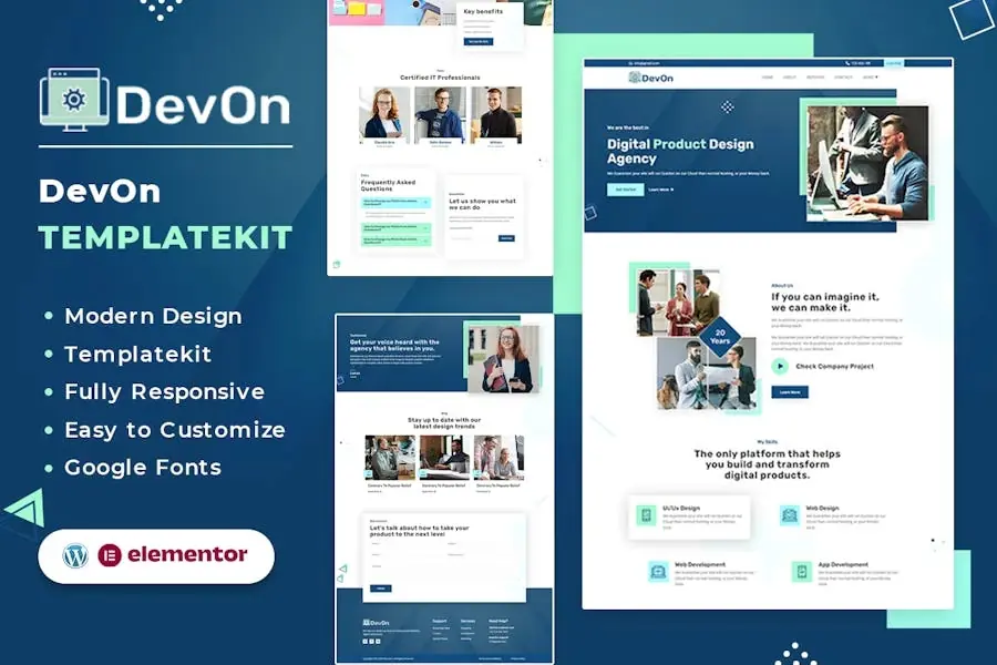 DeVon: el template kit Elementor de la agencia de diseño de productos digitales es una Colleción de Plantillas y páginas prediseñadas que se pueden utilizar para crear un sitio web para una agencia de diseño de productos digitales utilizando el generador de páginas Elementor. DeVon incluye Plantillas para páginas como la página de inicio, el Porfolio, los servicios y la página de contacto, todas diseñadas con una estética moderna y profesional. La plantilla de la página de inicio incluye secciones para presentar proyectos, servicios y testimonios de clientes, mientras que la página del Porfolio está diseñada para mostrar el trabajo de la agencia en un formato fácil de navegar. Las Plantillas también incluyen opciones de personalización de colores, fuentes y diseños, y widgets como una galería de Porfolio, una lista de servicios y testimonios que se pueden utilizar para añadir funciones adicionales al sitio web. Todas las Plantillas son totalmente responsivas, lo que significa que el sitio web se ajustará a cualquier tamaño de pantalla, proporcionando una experiencia cómoda para los usuarios en cualquier dispositivo. Este template kit Elementor para agencias de diseño de productos digitales es una solución ideal para crear un sitio web de aspecto profesional para su agencia sin conocimientos avanzados