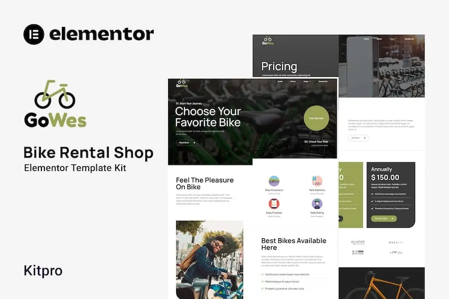 Gowes es un template kit Elometor para configurar un sitio web para una tienda de alquiler de bicicletas. El generador de páginas Elementor para WordPress le ayuda a crear un sitio web completo para su negocio con un diseño moderno y profesional. El kit incluye un sistema de diseño totalmente compatible e imágenes seleccionadas a mano por profesionales para comenzar tu próximo proyecto con una marca de primera calidad. Optimizado para su uso con el tema gratuito Hello Elementor, este kit está ajustado, se carga rápidamente y es totalmente responsivo.