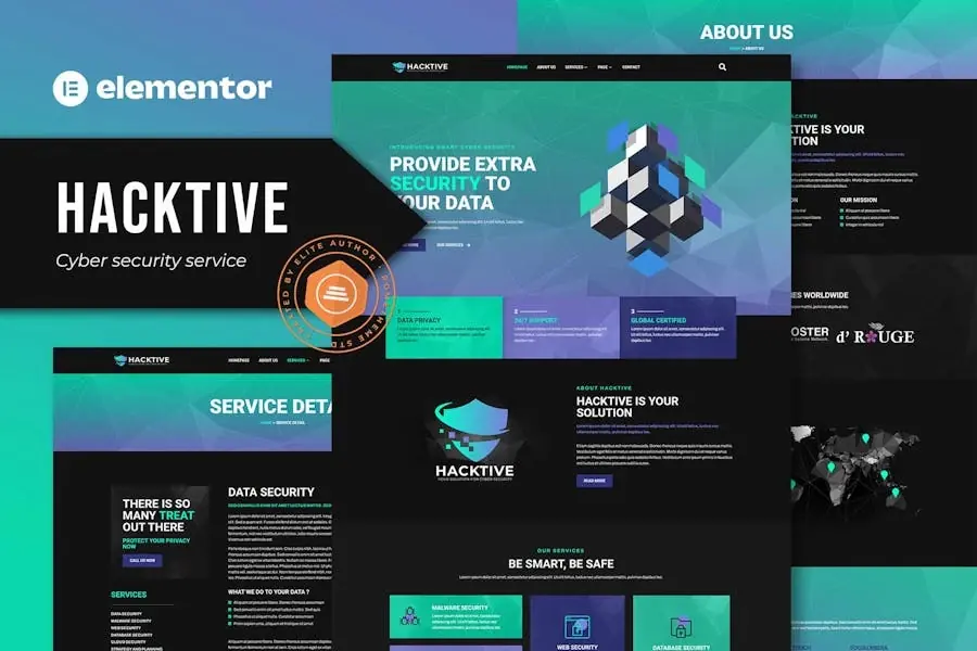 Bienvenido a Hacktive – Template Kit de Elementor del servicio de ciberseguridad. Hacktive es un tema totalmente receptivo, limpio, oscuro, colorido y personalizable que viene con una Colleción de seguridad cibernética, precios, servicios y muchos más.