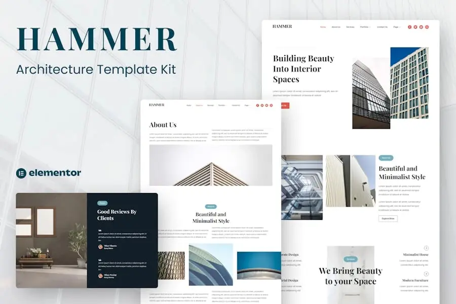 Hammer es un kit de plantillas de arquitectura que está diseñado para empresas personales o corporativas que desean mostrar su trabajo, sus servicios y su manera profesional. Estos Template Kits admiten una vista móvil responsiva. Para obtener información completa sobre este kit de plantillas, visita el enlace de demostración y disfruta del diseño.