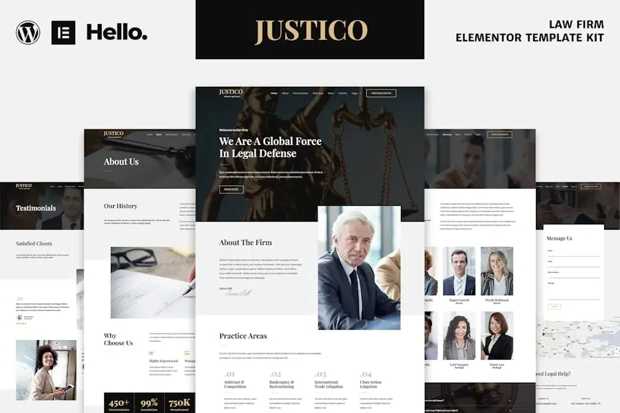 JUSTICO es un Template Kit Elementor limpio y moderno, creado específicamente para organizaciones legales y legales. Ya sea que se trate de un bufete de abogados, una oficina de abogados o un asesor legal, es fácil usar las páginas de Plantilla prediseñadas para crear rápidamente su sitio web. Contiene 24 plantillas diferentes y un estilo de kit global.