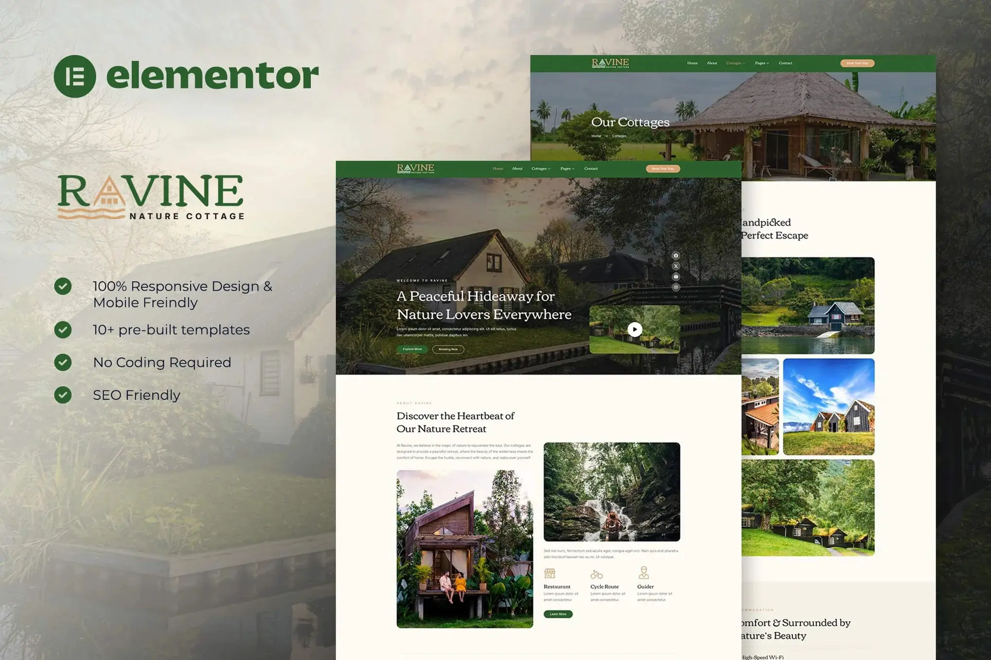 Ravine es un moderno y elegante Kit de Plantillas Elementor para sitios web de cabañas en la naturaleza. También puedes usar este creativo kit de plantillas para alojamiento, aventuras, mochileros, campamentos, cabañas, glamping, senderismo, montaña, naturaleza, actividades al aire libre, parques, excursiones, senderismo, etc. Ravine tiene un diseño simple, moderno y limpio con un diseño 100% responsivo, es muy fácil de personalizar y puede ser utilizado por cualquier persona sin tener