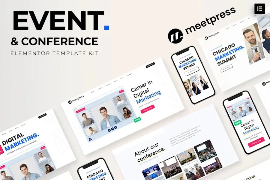 Meetpress es un Template Kit de elementos para eventos y conferencias moderno y limpio para crear un sitio web profesional y completamente funcional basado en WordPress sin una sola línea de codificación. Meetpress es totalmente adaptable y está listo para la retina y está equipado con varias funciones que se pueden obtener, como una plantilla de calendario que será el punto de partida perfecto para cualquier organización y sitio que esté a punto de anunciar conferencias, congresos, reuniones, seminarios web, cumbres, oradores, sesiones, exposiciones, invitaciones, conciertos, eventos deportivos y muchos otros eventos.