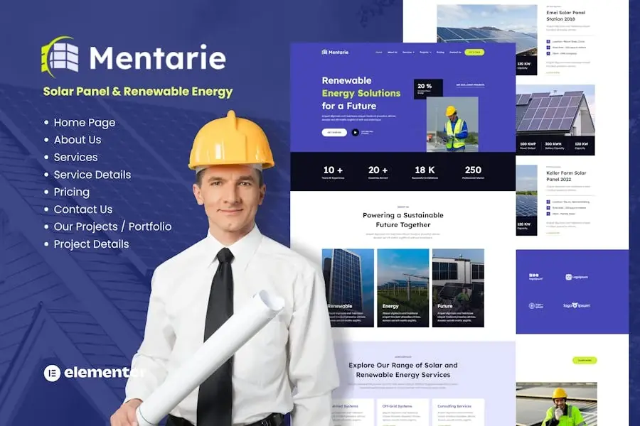 Mentarie: el mejor kit de Plantilla Elementor para sitios web de paneles solares y energía renovable. Este kit apto para SEO ofrece una variedad de Plantillas personalizables diseñadas para mostrar su compromiso con la sostenibilidad, la innovación y el medio ambiente. Con su interfaz fácil de usar y sus funciones avanzadas, Mentary facilita la creación de un sitio web que informe y eduque a los visitantes sobre los beneficios de la energía solar y la energía renovable. Las Plantillas son totalmente personalizables y adaptables, lo que garantiza que tu sitio web se vea bien en cualquier dispositivo. Ya sea que esté exhibiendo sus servicios de instalación o promocionando sus productos de paneles solares, Mentary proporciona la plataforma perfecta para ayudarlo a destacar la eficiencia y la potencia de la energía solar. Mejore su presencia en línea hoy mismo con Mentary.
