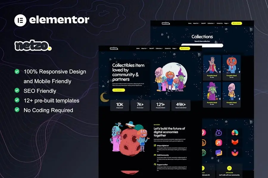 Netzo es el template kit elementor para la Porfolio de NFT y el sitio web de artículos digitales. Puedes usar este template kit creativas para Porfolio de NFT, cripto-coleccionables, artículos digitales y más. Tiene 12 plantillas prediseñadas con un diseño genial y un estilo moderno. Fácil de editar y personalizar con la función de arrastrar y soltar.