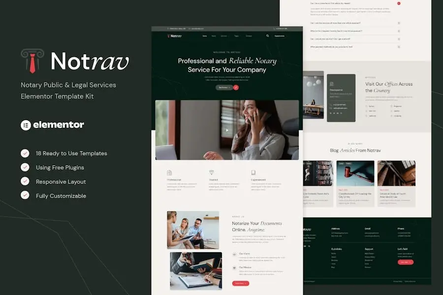 Notrav: Template Kit Elementor para servicios notariales y legales creado especialmente para consultoría, servicios notariales, asesores legales, abogados o cualquier servicio legal profesional. Insurve tiene un diseño simple, moderno y limpio con un diseño 100% responsivo, y es muy fácil de personalizar y puede ser utilizado por cualquier persona sin tener que entender la codificación. Este template kit incluye 13 páginas y 18 impresionantes plantillas cuidadosamente diseñadas, para que puedas crear tu sitio web de aspecto profesional con solo un clic
