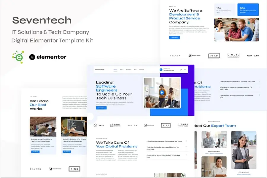 Seventech es un template kit de Elementor que lo ayuda específicamente a crear un sitio web para tecnología, empresa de TI, agencia digital, servicio tecnológico, desarrollador web, empresa emergente, solución de TI o sitio web empresarial. Es totalmente responsivo y se adapta a varias pantallas y resoluciones, desde pantallas de escritorio normales hasta tabletas, iPhones y pequeños dispositivos móviles. Es muy fácil y no se requiere codificación para crear un sitio web completo.