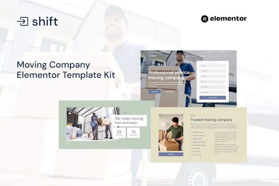 Shift es un Template Kit Elementor profesional para el sitio web de una empresa Tiene un diseño simple y limpio con un estilo de diseño moderno. Diseñado para usar con la versión Elementor Free, listo para importar y reutilizable para el sitio web de la empresa de mudanzas Funciona con la mayoría de los temas y está optimizado para su uso con el tema gratuito Hello Elementor.