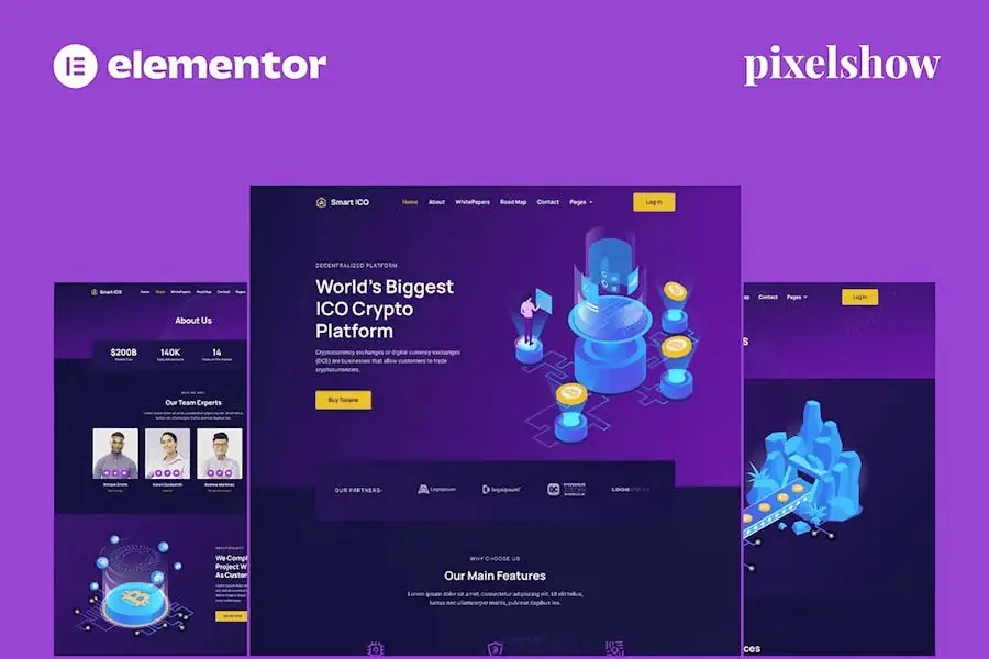 Smart ICO es un kit de sitio completo de Elementor Pro para crear de forma rápida y fácil Plantillas Web diseñadas para sitios web de intercambio y minería de criptomonedas de bitcoin.