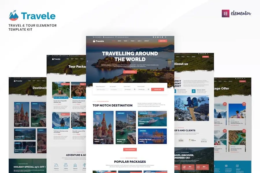 Travele: un template kit para Agencia de viajes y turismo para Elementor Pro creado especialmente para crear sitios versátiles como Agencia de viajes, tours, sitios web de viajes, operadores turísticos, turismo, viajes, destinos, reservas de viajes, aventuras, alojamiento y todos los demás sitios web y negocios de viajes y turismo sin una sola línea de codificación.