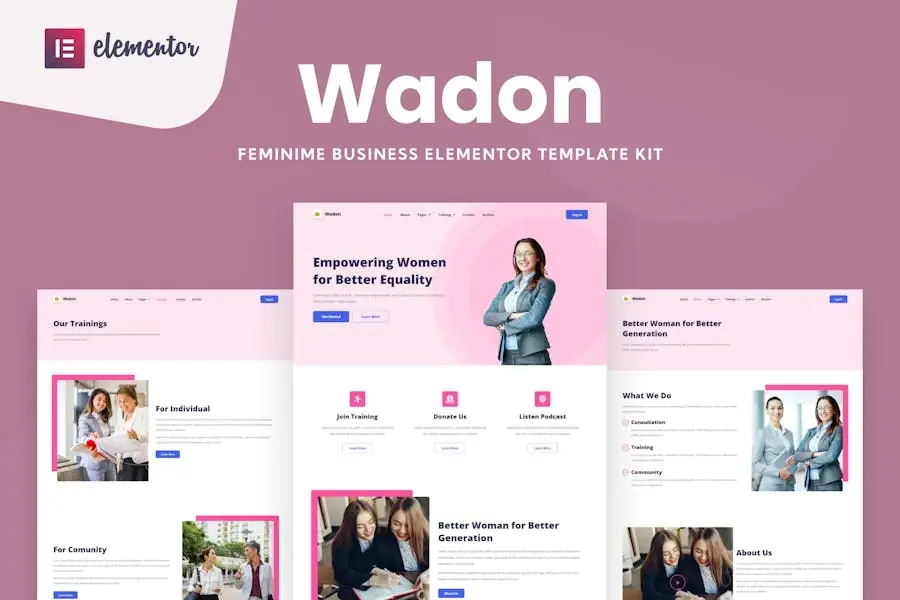 plantilla de sitio web Wadon – Feminine Business Consultant es un kit de plantillas de Elementor para crear rápida y fácilmente un sitio web completo de deportes electrónicos para tu clan, gremio o equipo de juego. Está optimizado para el tema gratuito Hello Elementor, pero se puede usar con la mayoría de los temas compatibles con el creador de páginas Elementor. Personaliza las Fuentes y los colores mediante los controles integrados de Estilos de Tema de Elementor y carga tus Fotos, Logotipos y contenido mediante el generador visual de arrastrar y soltar. Este kit está diseñado para usarse con Elementor Pro e incluye soporte para plantillas globales de Theme Builder, como encabezado, pie de página y blog